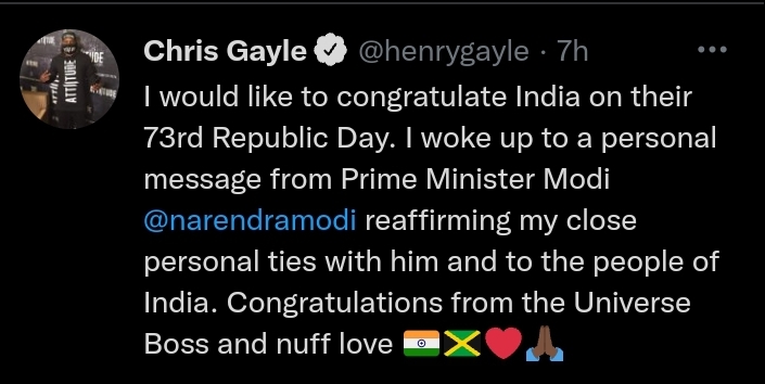 এদিন সকালে ভারতবাসীকে প্রজাতন্ত্র দিবসের শুভেচ্ছা জানিয়ে ট্যুইটারে গেইল লেখেন, ”আমি ভারতকে ৭৩তম প্রজাতন্ত্র দিবসের অনেক শুভেচ্ছা । আজ প্রধানমন্ত্রী নরেন্দ্র মোদির ব্যক্তিগত মেসেজে আমার ঘুম ভাঙল।”