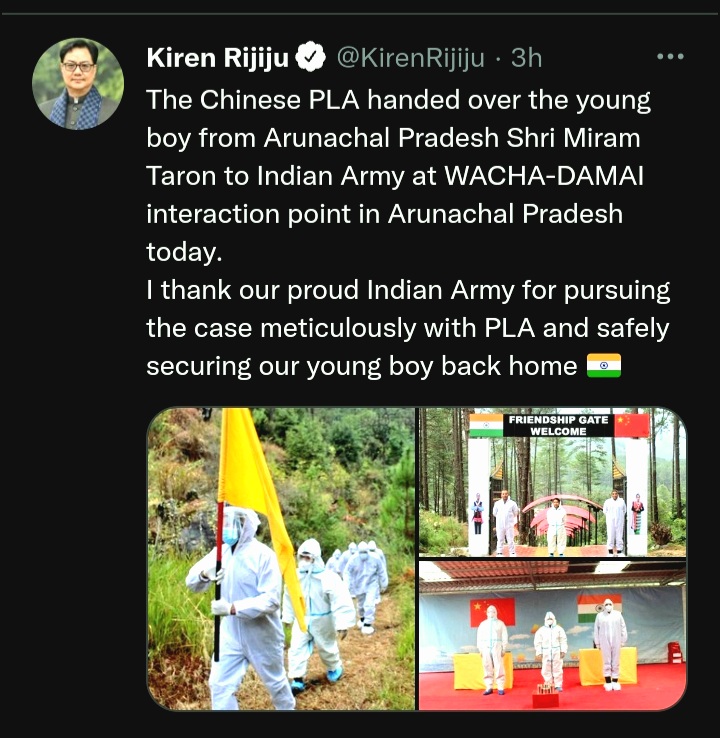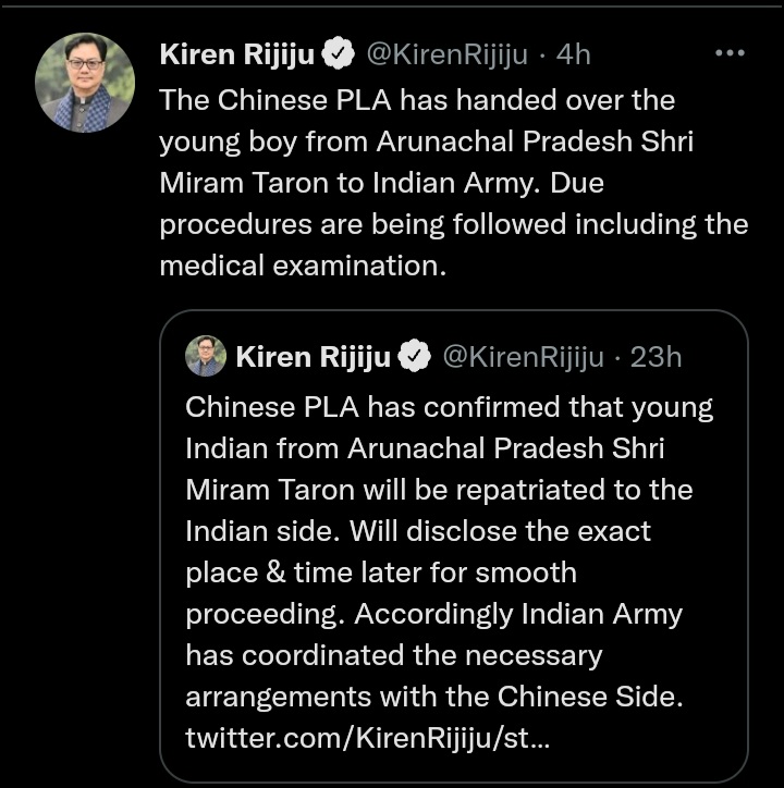 এরপর আজ ট্যুইট করে আইন মন্ত্রী কিরেন রিজিজু জানিয়েছেন, “চিনা সেনা অরুণাচল প্রদেশের তরুণ শ্রী মিরাম তারোনকে ভারতীয় সেনার হাতে তুলে দিয়েছে। ওর শারীরিক পরীক্ষা সহ যাবতীয় বিধি মেনে চলা হচ্ছে।”