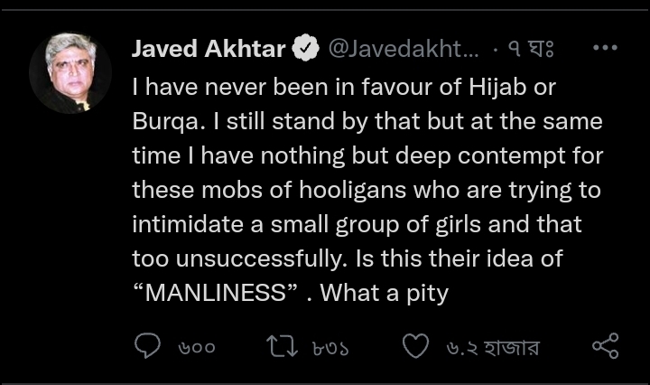 বৃহস্পতিবার জাভেদ আখতার তাঁর টুইটে লেখেন, ‘আমি কখনই হিজাব বা বোরখা পরার পক্ষে ছিলাম না। আমি এখনও এর পক্ষে নই ।কিন্তু একইসঙ্গে একদল গুন্ডা যারা, একটি মেয়েকে হিজাব পরার জন্য ভয় দেখানোর চেষ্টা করে এবং ব্যর্থ হয়, তাদের জন্য ধিক্কার। এটাই কী তাদের কাছে পুরুষত্বের ধারণা?’ জাভেদ আখতারের পাশাপাশি হিজাব বিতর্কে সরব হয়েছেন স্বরা ভাস্কর থেকে হেমা মালিনী।