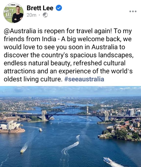 তবে এর মধ্যেই ভারতীয় পর্যটকদের আশার কথা শুনিয়েছেন কিংবদন্তি প্রাক্তন অস্ট্রেলিয়ান ক্রিকেটার ব্রেট লি (brett lee)। ইতিমধ্যেই দেশে পর্যটকদের জন্য দরজা খুলে দিয়েছে অস্ট্রেলিয়া। আর সোশ্যাল মিডিয়ায় ভারতীয়দের সে দেশে আমন্ত্রণ জানিয়েছেন ব্রেট লি। একই সঙ্গে অস্ট্রেলিয়ালিয়ার নৈসর্গিক দৃশ্য সহ সংস্কৃতি বিষয়ক স্থানগুলো উপভোগ করার জন্য আহ্বান জানিয়েছেন।